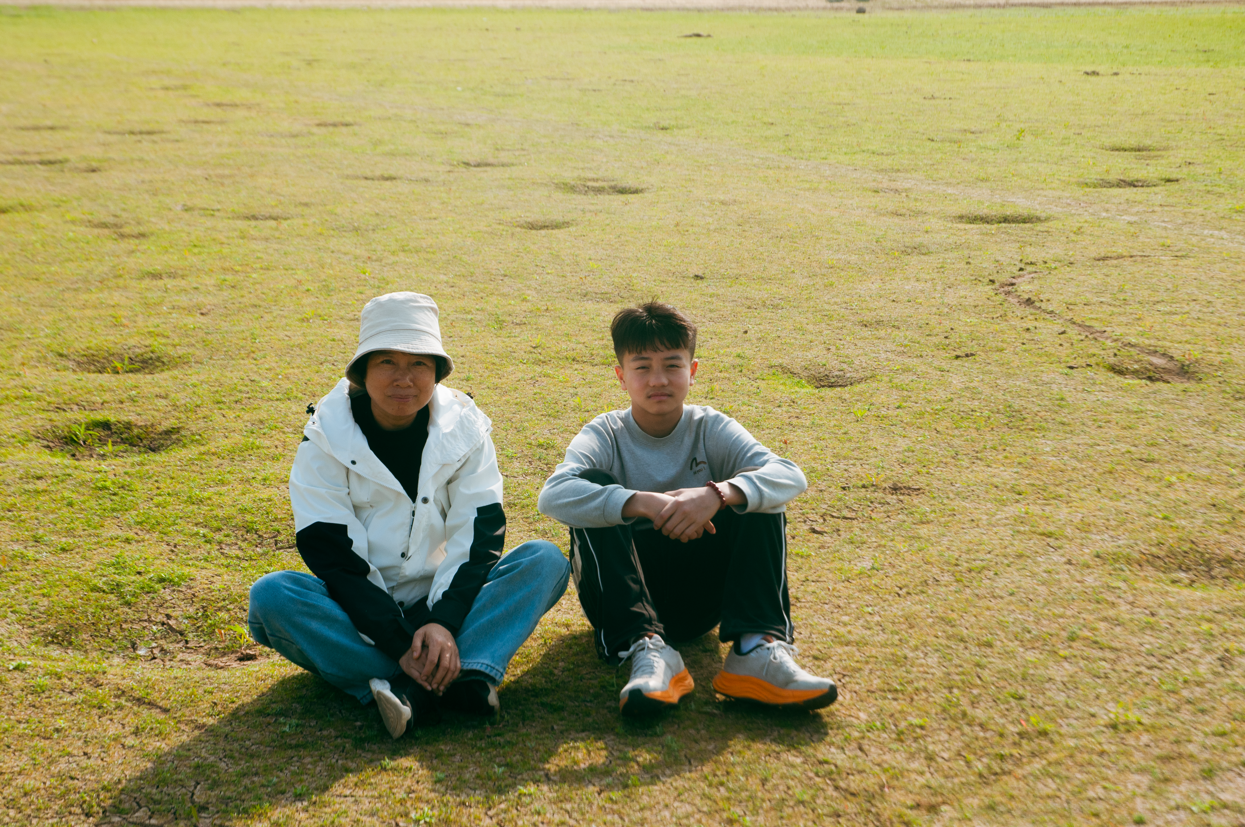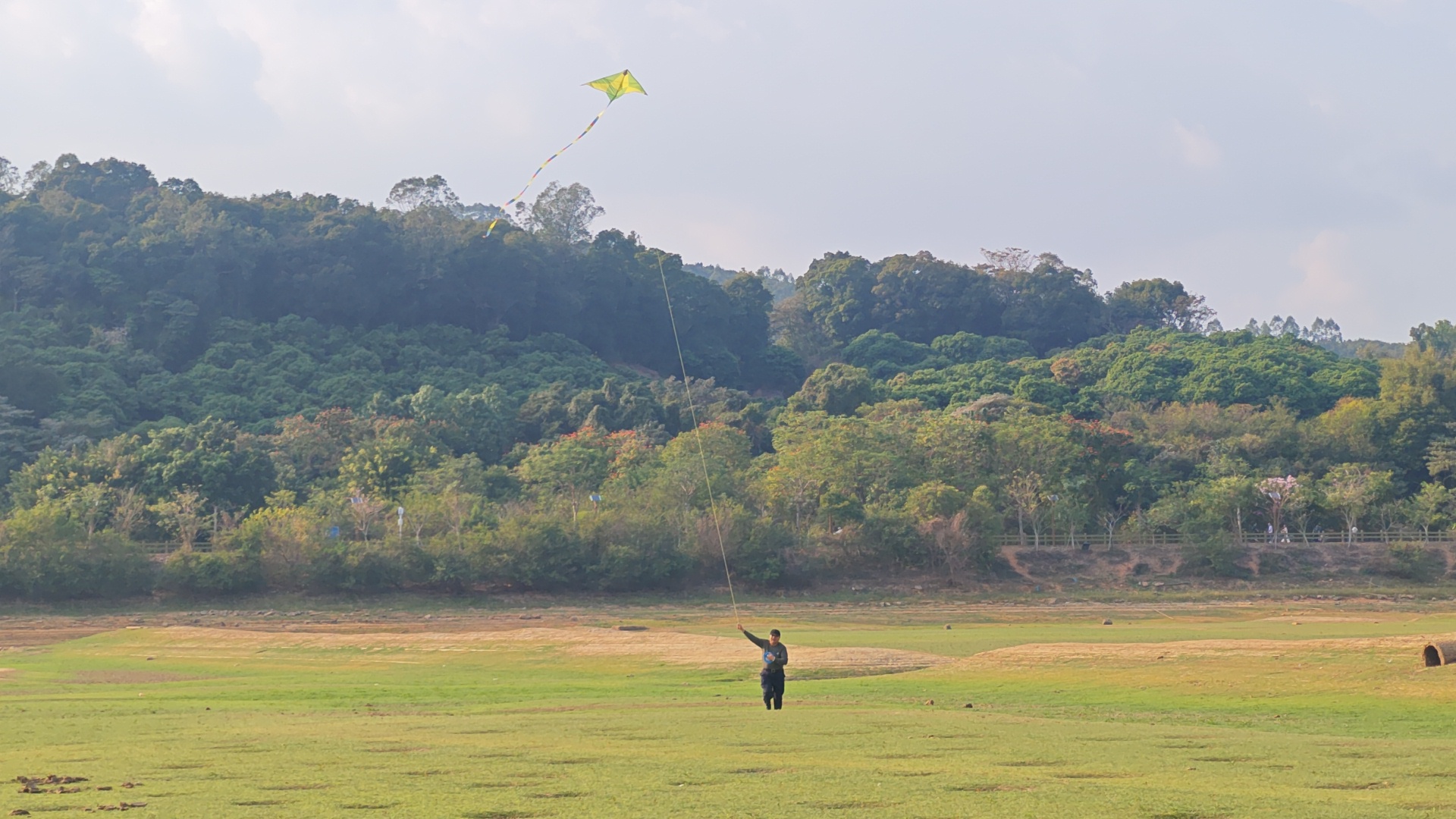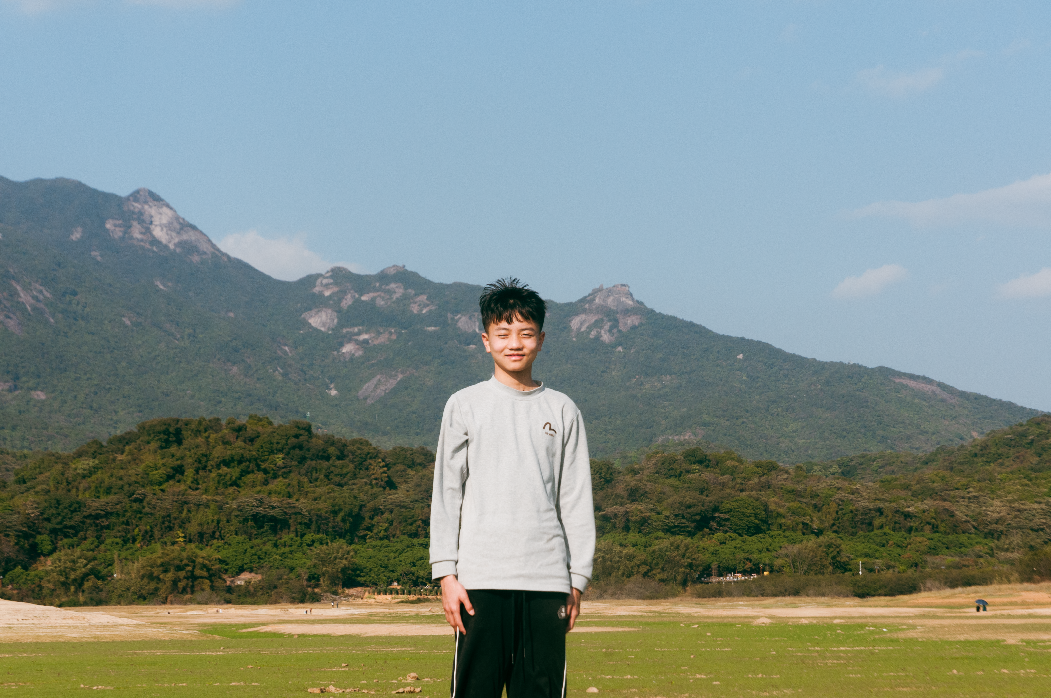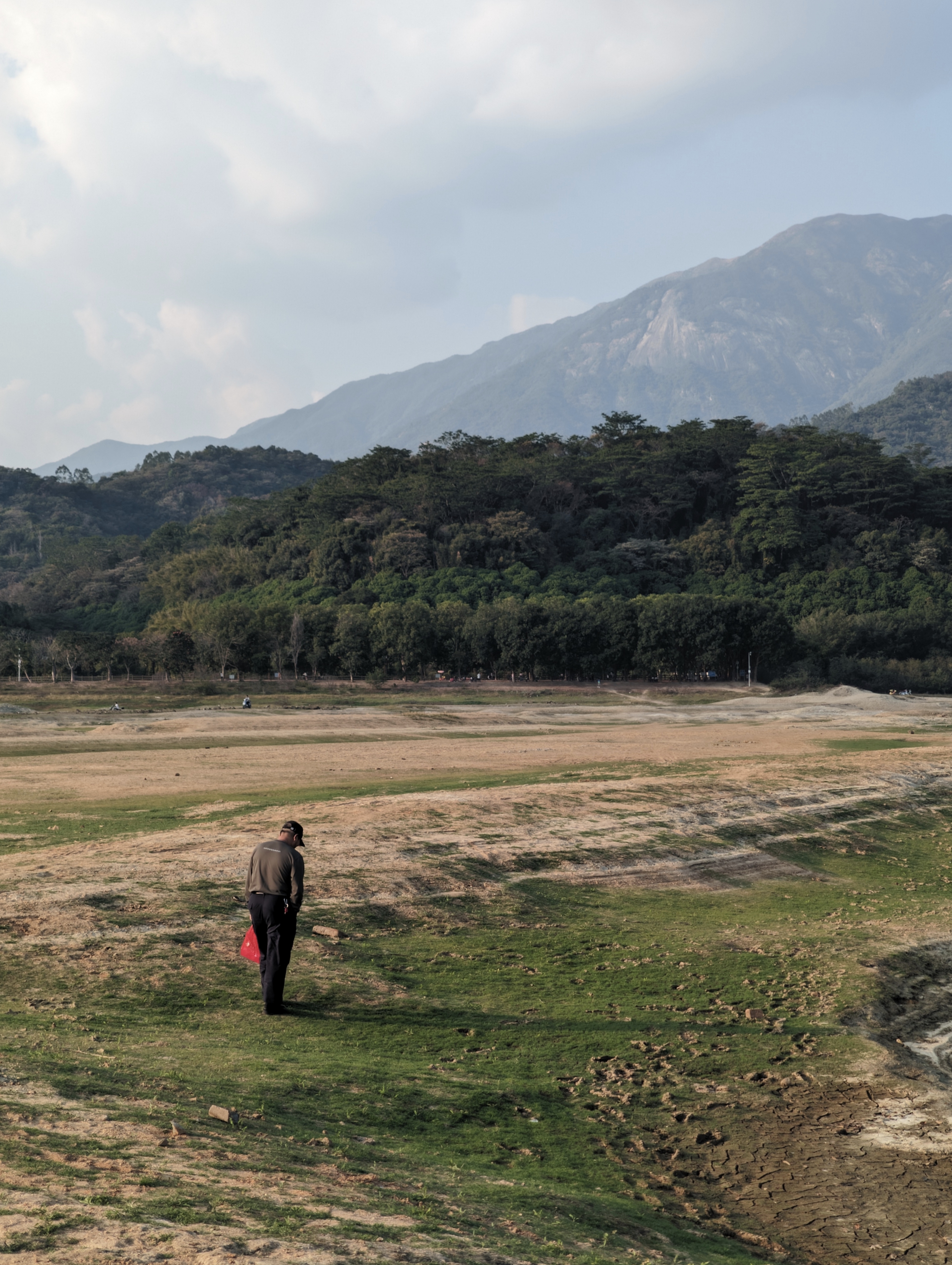 第一天是我们全家人都一起去的这个干涸的水库,我记得那天风很大,阳光特别好。经过几个月的干涸,湖底长出来一层薄薄的草,在远处看去就像是一片草原,加上背景的罗浮山,天上的白云,脸旁吹过的微风,构成了一种全方位无死角,从视觉到触觉都舒服的美好感受,直到现在我回忆起来都能感觉到。